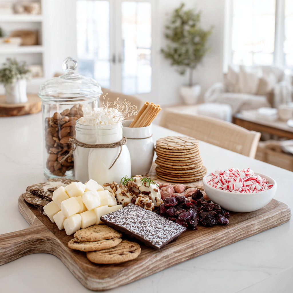 Fill little bowls with marshmallows, crushed candy canes, and chocolate chips. Add cookies and sweet treats—it’s a fun holiday party idea!
